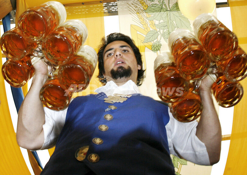【ドイツ 30日 AFP】2006年のドイツのビールの売上が前年より1.4パーセントの上昇を記録したことが29日、明らかになった。これは6月から7月に渡り開催された06サッカーW杯の大きな影響によるもので、過去10年で最大の伸び幅だった。ドイツのビール醸造所では2006年、106億8000万リットルのビールを売り、2005年の105億4000万リットルを上回ったことが公式に発表された。この数字は2002年以来最大。ドイツにおいてのビール消費量は過去10年間減少傾向にある。写真はミュンヘンの伝統行事であるビール祭「オクトーバーフェスト(Oktoberfest)」でマス(Mass)と呼ばれる1リットルのジョッキを運ぶウェイター(2006年9月16日撮影)。(c)AFP/JOE KLAMAR