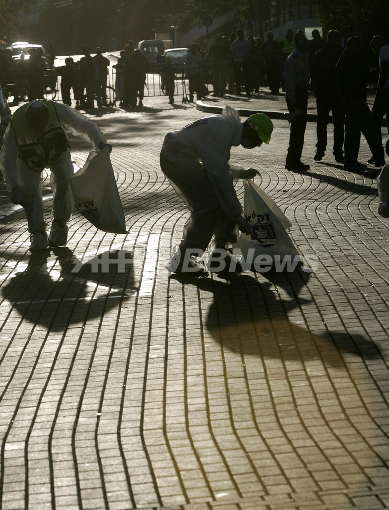 写真は、 エイラートで29日、自爆テロ現場で遺体を片づけるユダヤ教超正統派の男性。(c)AFP/MENAHEM KAHANA