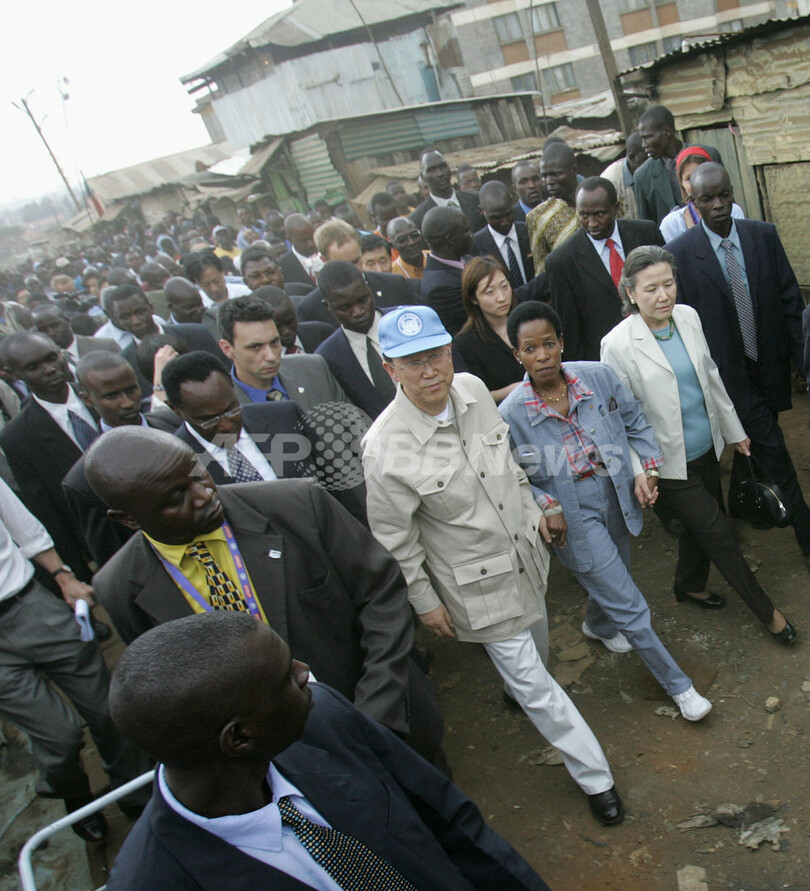写真は同日、キベラ地区を視察する潘事務総長。(c)AFP/DON EMMERT