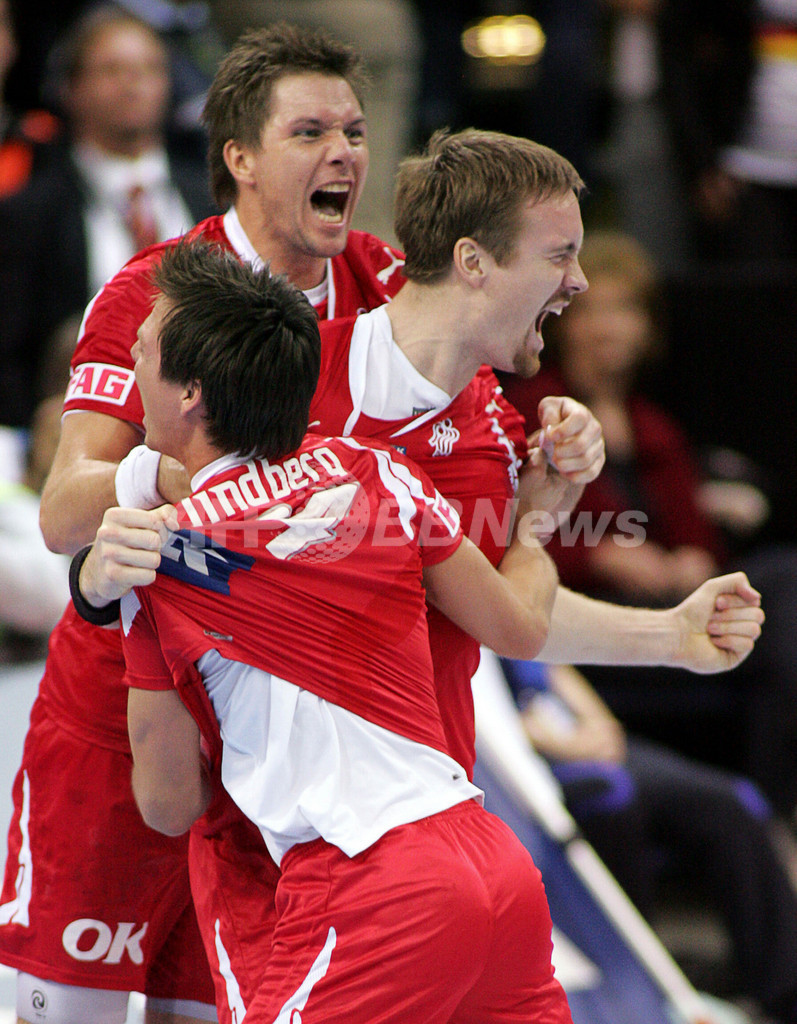 【ハンブルク/ドイツ 30日 AFP】ハンドボール、男子ハンドボール世界選手権2007(Men’s Handball World Championship)・準々決勝、アイスランドvsデンマーク。試合はデンマークが42-41でアイスランドとの接戦に勝利し準決勝進出を果たした。また、敗れたアイスランドは5-8位決定戦に回ることが決まった。写真は、チームメイトと共に勝利を喜ぶデンマークのHans Lindberg(左)。(c)AFP/ATTILA KISBENEDEK