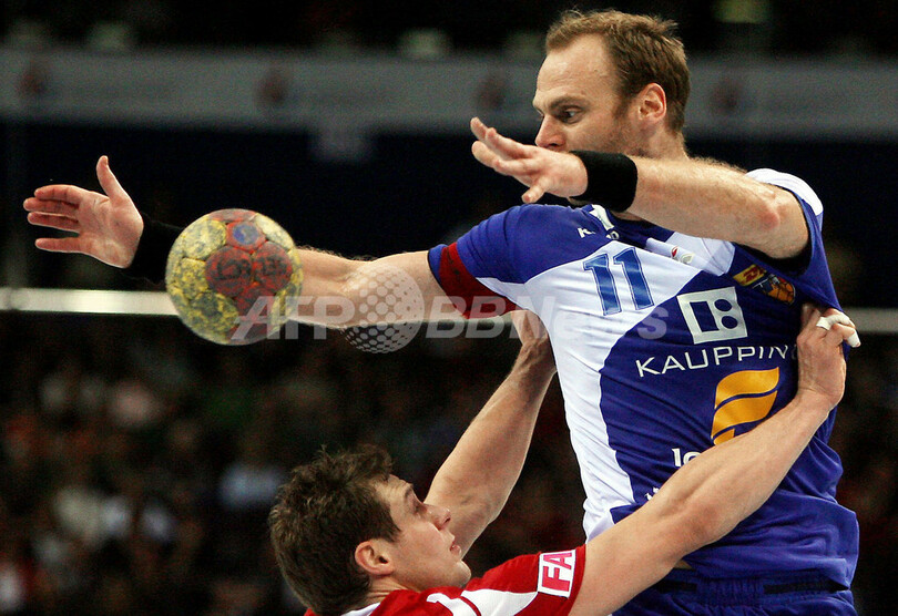 【ハンブルク/ドイツ 30日 AFP】ハンドボール、男子ハンドボール世界選手権2007(Men’s Handball World Championship)・準々決勝、アイスランドvsデンマーク。試合はデンマークが42-41でアイスランドとの接戦に勝利し準決勝進出を果たした。また、敗れたアイスランドは5-8位決定戦に回ることが決まった。写真は、チームメイトと共に勝利を喜ぶデンマークのHans Lindberg(左)。(c)AFP/ATTILA KISBENEDEK