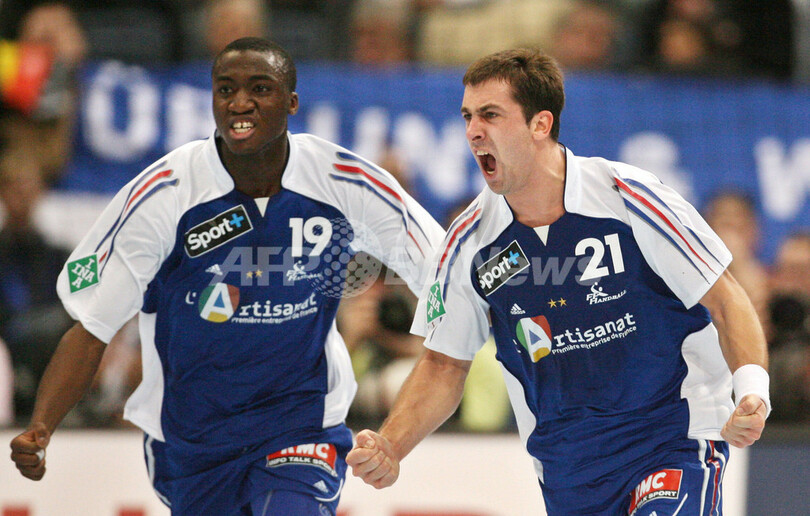 【ケルン/ドイツ 30日 AFP】ハンドボール、男子ハンドボール世界選手権2007(Men’s Handball World Championship)・準々決勝、クロアチアvsフランス。試合はフランスが21-18でクロアチアとの接戦に勝利し準決勝進出を果たした、また敗れたクロアチアは5-8位決定戦へ回ることが決まった。写真は、チームメイトの(Thierry Omeyer、左)と共に勝利を喜ぶフランスのニコラ・カラバティッチ(Nikola Karabatic)。(c)AFP/JACQUES DEMARTHON