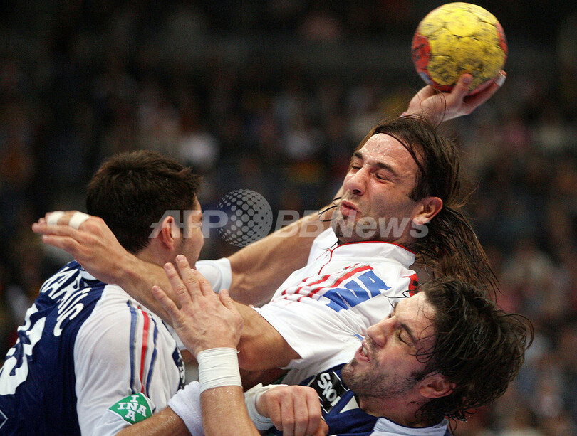 【ケルン/ドイツ 30日 AFP】ハンドボール、男子ハンドボール世界選手権2007(Men’s Handball World Championship)・準々決勝、クロアチアvsフランス。試合はフランスが21-18でクロアチアとの接戦に勝利し準決勝進出を果たした、また敗れたクロアチアは5-8位決定戦へ回ることが決まった。写真は、チームメイトの(Thierry Omeyer、左)と共に勝利を喜ぶフランスのニコラ・カラバティッチ(Nikola Karabatic)。(c)AFP/JACQUES DEMARTHON