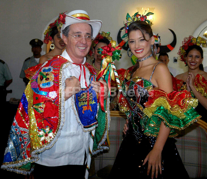 【バランキヤ/コロンビア 31日 AFP】2003年世界遺産(UNESCO)の無形遺産に登録された、「バランキーヤのカーニバル(Barranquilla’s Carnival)」が2月17日から20日まで開催される。19世紀から続くこのカーニバルの期間中、ストリート・ダンスやパレードなどにより、街はその機能を果たさなくなるという。写真はカーニバルを数週間後に控えた30日、鮮やかな衣装を纏うアルバロ・ウリベ・ベレス(Alvaro Uribe Velez)大統領(左)。(c)AFP/Fernando RUIZ-PRESIDENCIA