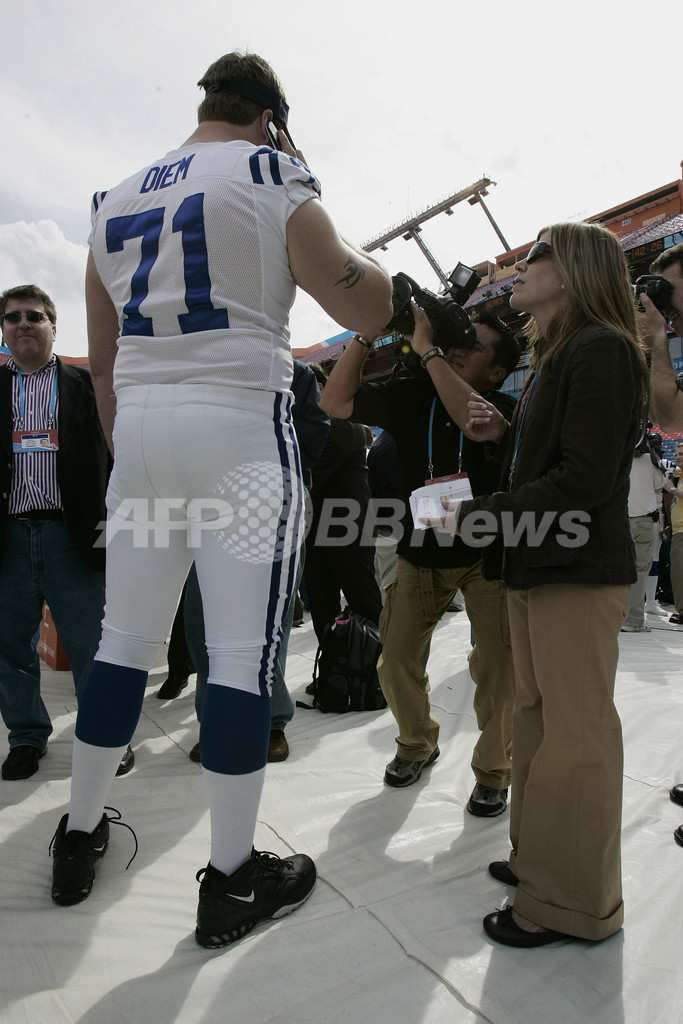 【マイアミ/米国 30日 AFP】NFL、第41回スーパーボウル(Super Bowl XLI)が2月4日に行われるドルフィン・スタジアム(Dolphin Stadium)でメディアデーが開催され、インディアナポリス・コルツ(Indianapolis Colts)とシカゴ・ベアーズ(Chicago Bears)の選手は、会場に駆けつけた数千の記者からの取材に応じた。(c)AFP/Getty Images Roberto Schmidt