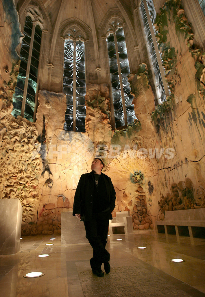 【マジョルカ/スペイン 1日 AFP】画家で彫刻家のミケル・バルセロ(Miquel Barcelo)が7年がかりで、パルマ大聖堂(La Seu (Palma Cathedral))内に作りあげた土の作品の除幕式が2日、スペイン王室によって執り行われる。その歴史は13世紀まで遡るという、ゴシック様式の同大聖堂は、マジョルカの観光名所のひとつでもある。写真は同大聖堂でポーズをとるミケル・バルセロ。(c)AFP/Jaime REINA
