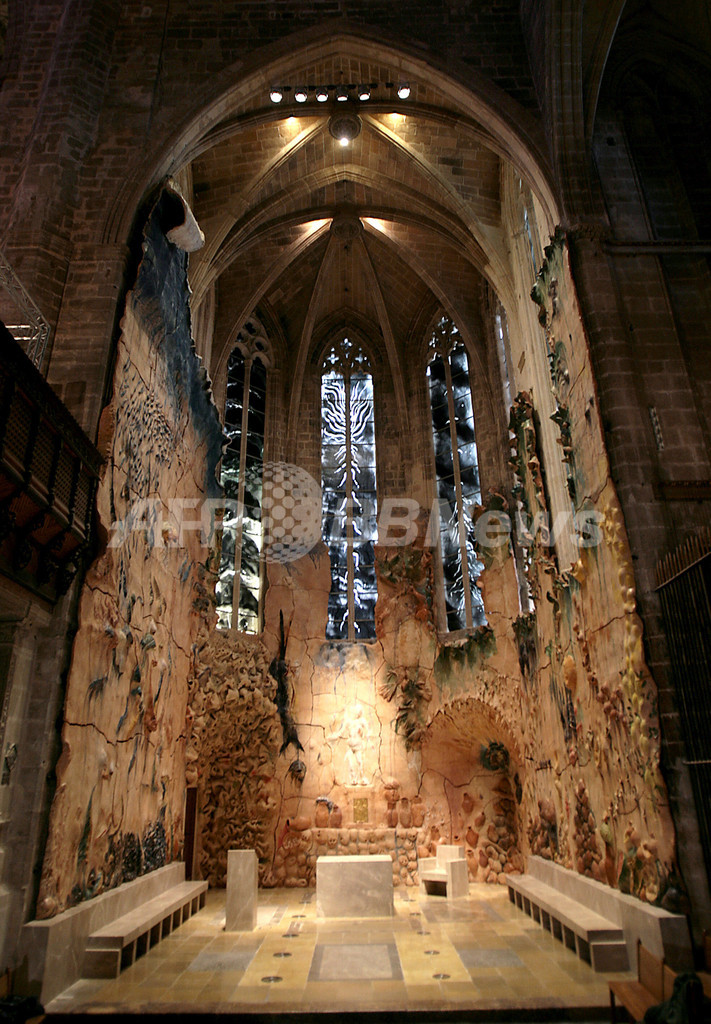 【マジョルカ/スペイン 1日 AFP】画家で彫刻家のミケル・バルセロ(Miquel Barcelo)が7年がかりで、パルマ大聖堂(La Seu (Palma Cathedral))内に作りあげた土の作品の除幕式が2日、スペイン王室によって執り行われる。その歴史は13世紀まで遡るという、ゴシック様式の同大聖堂は、マジョルカの観光名所のひとつでもある。写真は同大聖堂でポーズをとるミケル・バルセロ。(c)AFP/Jaime REINA
