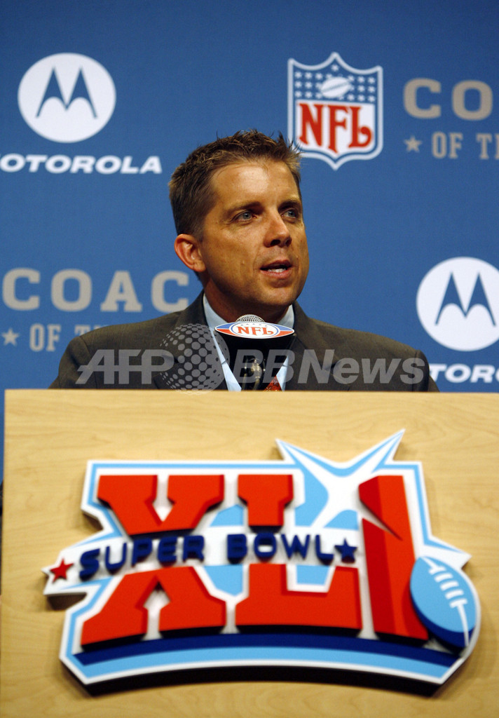 【マイアミ/米国 31日 AFP】ニューオーリンズ・セインツ(New Orleans Saints)のヘッドコーチ、ショーン・ペイトン(Sean Payton)は、フロリダ州マイアミビーチ・コンベンションセンター(Miami Beach Convention Center)で開催されたNFL年間アワードに出席し、2005年シーズンで3勝しか出来なかった弱小チームを2006年シーズンでは10勝6敗とNFC南地区制覇に導き、大型ハリケーン「カトリーナ(Hurricane Katrina)」で震災したニューオーリンズの復興への貢献が称えられてNFL年間最優秀コーチ賞(Motorola NFL Coach of the Year)を授賞した。(c)AFP/Getty Images Eliot J. Schechter