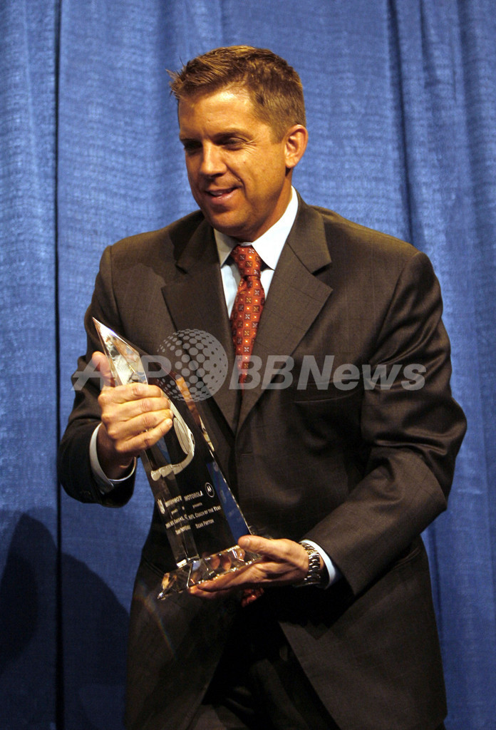 【マイアミ/米国 31日 AFP】ニューオーリンズ・セインツ(New Orleans Saints)のヘッドコーチ、ショーン・ペイトン(Sean Payton)は、フロリダ州マイアミビーチ・コンベンションセンター(Miami Beach Convention Center)で開催されたNFL年間アワードに出席し、2005年シーズンで3勝しか出来なかった弱小チームを2006年シーズンでは10勝6敗とNFC南地区制覇に導き、大型ハリケーン「カトリーナ(Hurricane Katrina)」で震災したニューオーリンズの復興への貢献が称えられてNFL年間最優秀コーチ賞(Motorola NFL Coach of the Year)を授賞した。(c)AFP/Getty Images Eliot J. Schechter