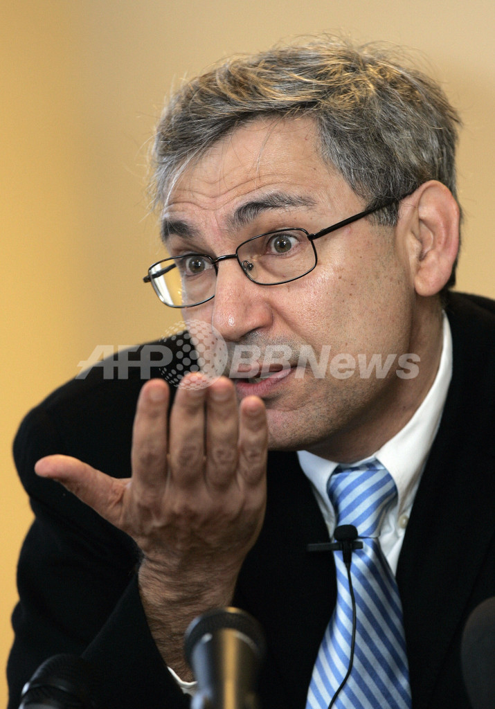 写真はストックホルムで開催された会見に臨んだ際のパムク氏(2006年12月6日)。(c)AFP/SVEN NACKSTRAND