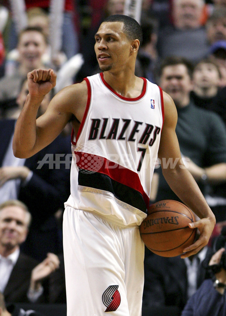 【ポートランド/米国 31日 AFP】06-07NBA、ポートランド・トレイルブレイザーズ(Portland Trail Blazers)vsデンバー・ナゲッツ(Denver Nuggets)。トレイルブレイザーズのブランドン・ロイ(Brandon Roy)は、21日のミルウォーキー・バックス(Milwaukee Bucks)戦で記録したキャリアハイの28得点に次ぐ25得点8アシストの活躍でチームの勝利に貢献。試合は第4Q開始と同時にリードを奪ったトレイルブレイザーズが100-91でナゲッツを振り切り、ホームでの連勝を4に伸ばした。写真は、勝利を喜ぶロイ。(c)AFP/Getty Images Jonathan Ferrey