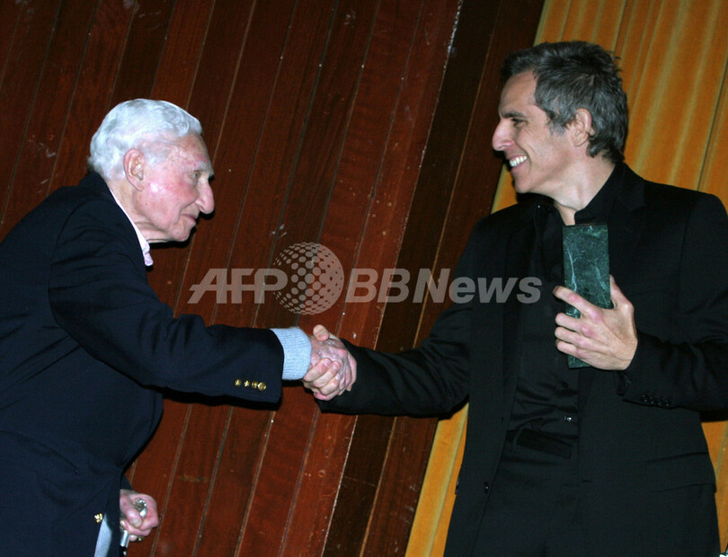 【カルバーシティー/米国 2日 AFP】2004年にスタートしたバックロット映画祭(Backlot Film Festival)が今年も1月30日から2月3日まで開催されている。31日には、映画監督/脚本家のバッド・シュールバーグ(Budd Schulberg)の功績を称えるセレモニーが開催され、俳優のベン・スティラー(Ben Stiller)が祝福に駆けつけた。シュールバーグは、マーロン・ブランド(Marlon Brando)が主演を務めた「波止場(On the Waterfront)」や「群衆の中の一つの顔(A Face in the Crowd)」の脚本などで知られる。写真は握手を交わすバッド・シュールバーグ(左)とベン・スティラー(右)。(c)AFP/Getty Images Marsaili McGrath