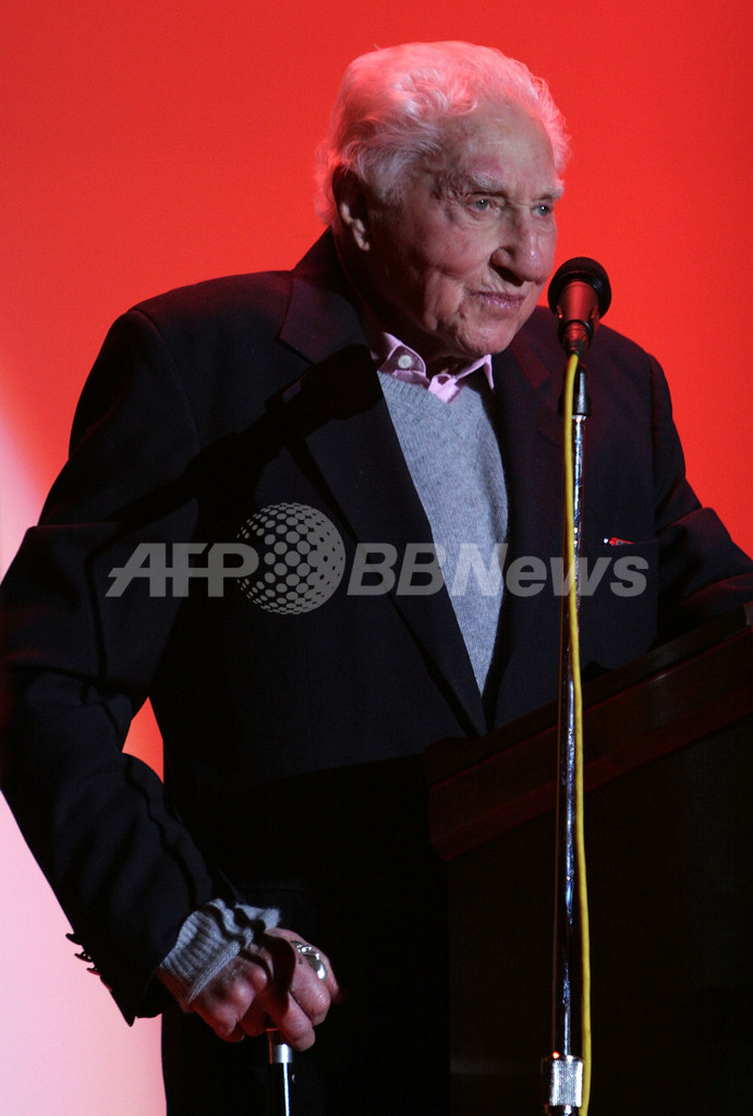 【カルバーシティー/米国 2日 AFP】2004年にスタートしたバックロット映画祭(Backlot Film Festival)が今年も1月30日から2月3日まで開催されている。31日には、映画監督/脚本家のバッド・シュールバーグ(Budd Schulberg)の功績を称えるセレモニーが開催され、俳優のベン・スティラー(Ben Stiller)が祝福に駆けつけた。シュールバーグは、マーロン・ブランド(Marlon Brando)が主演を務めた「波止場(On the Waterfront)」や「群衆の中の一つの顔(A Face in the Crowd)」の脚本などで知られる。写真は握手を交わすバッド・シュールバーグ(左)とベン・スティラー(右)。(c)AFP/Getty Images Marsaili McGrath