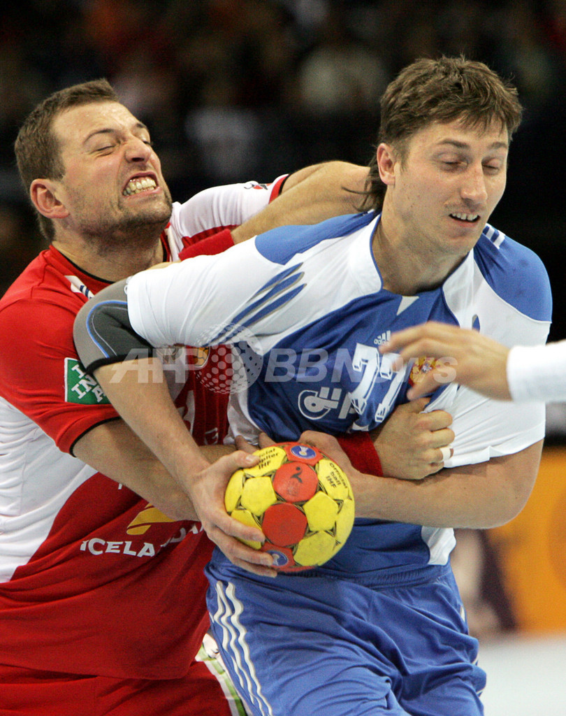 【ハンブルク/ドイツ 1日 AFP】ハンドボール、男子ハンドボール世界選手権2007(Men’s Handball World Championship)・5-8位決定戦、ロシアvsアイスランド。ロシアのVitali Ivanovは、この試合6ゴールを挙げる活躍でチームの勝利に貢献した。試合はロシアが28-25でアイスランドに勝利し、5-6決定戦進出を決めた。尚、敗れたアイスランドは7-8位決定戦に回る。写真は、アイスランドのスヴェルリル・ヤコブソン(Sverrir Jakobsson)にチェックを受けるIvanov(右)。(c)AFP/ATTILA KISBENEDEK