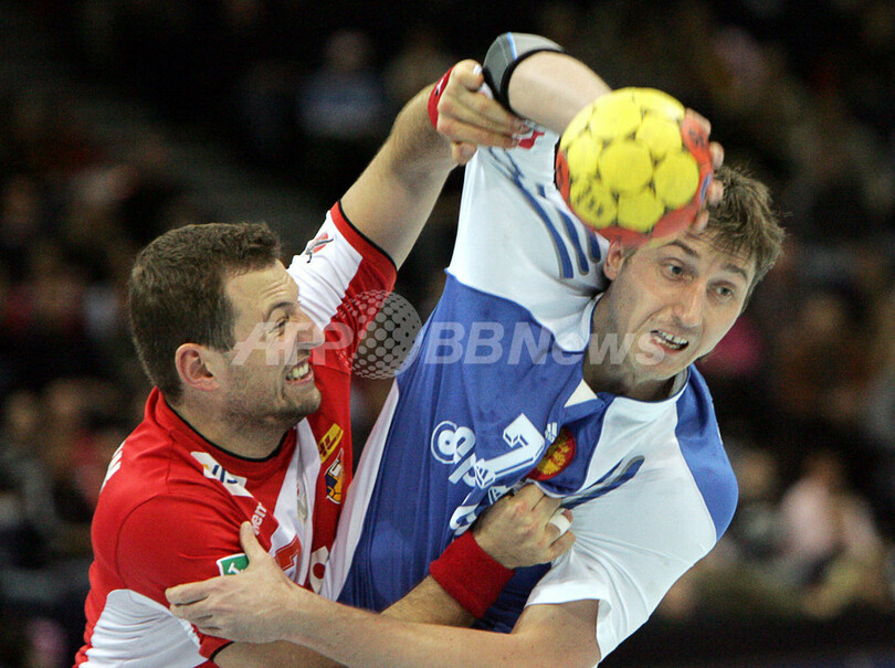 【ハンブルク/ドイツ 1日 AFP】ハンドボール、男子ハンドボール世界選手権2007(Men’s Handball World Championship)・5-8位決定戦、ロシアvsアイスランド。ロシアのVitali Ivanovは、この試合6ゴールを挙げる活躍でチームの勝利に貢献した。試合はロシアが28-25でアイスランドに勝利し、5-6決定戦進出を決めた。尚、敗れたアイスランドは7-8位決定戦に回る。写真は、アイスランドのスヴェルリル・ヤコブソン(Sverrir Jakobsson)にチェックを受けるIvanov(右)。(c)AFP/ATTILA KISBENEDEK
