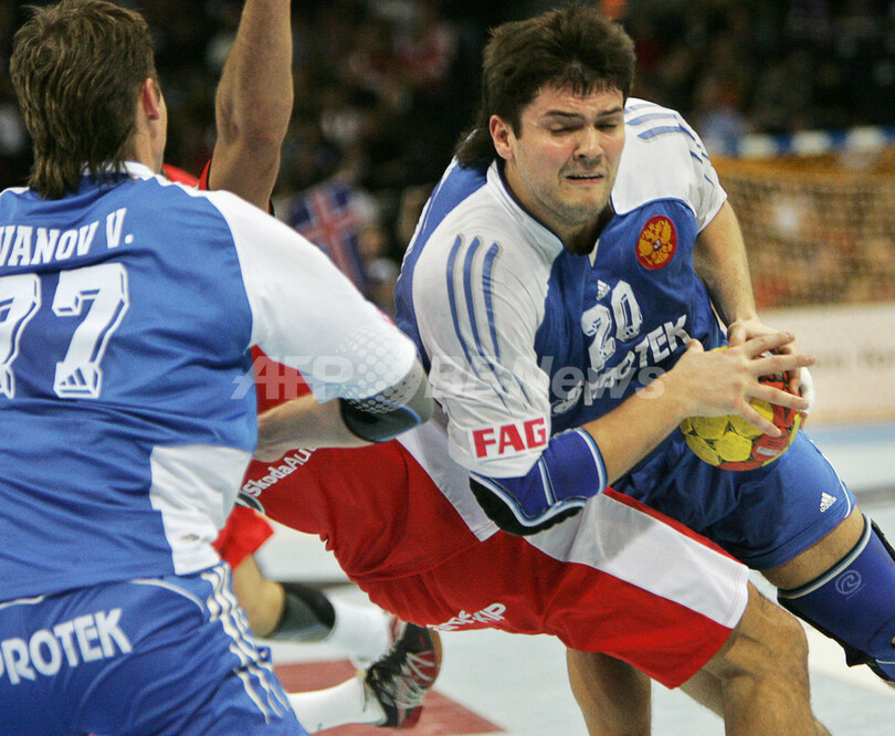 【ハンブルク/ドイツ 1日 AFP】ハンドボール、男子ハンドボール世界選手権2007(Men’s Handball World Championship)・5-8位決定戦、ロシアvsアイスランド。ロシアのVitali Ivanovは、この試合6ゴールを挙げる活躍でチームの勝利に貢献した。試合はロシアが28-25でアイスランドに勝利し、5-6決定戦進出を決めた。尚、敗れたアイスランドは7-8位決定戦に回る。写真は、アイスランドのスヴェルリル・ヤコブソン(Sverrir Jakobsson)にチェックを受けるIvanov(右)。(c)AFP/ATTILA KISBENEDEK