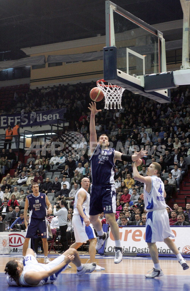 【イスタンブール/トルコ 1日 AFP】バスケットボール、ユーロリーグ・グループA、エフェス・ピルセン(Efes Pilsen)vsディナモ・モスクワ(Dynamo Moscow)。エフェス・ピルセンのエルマル・カートルー(Ermal Kurtoglu)はこの試合、16得点6リバウンドを挙げた。試合は既にTOP16への出場を決めているエフェス・ピルセンが72-76でディナモ・モスクワに敗れ、レギュラーシーズンを8勝6敗で終えた。写真は、ゴール下からシュートを放つカートルー。(c)AFP/HOCINE ZAOURAR