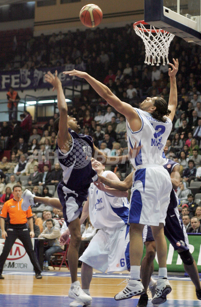 【イスタンブール/トルコ 1日 AFP】バスケットボール、ユーロリーグ・グループA、エフェス・ピルセン(Efes Pilsen)vsディナモ・モスクワ(Dynamo Moscow)。エフェス・ピルセンのエルマル・カートルー(Ermal Kurtoglu)はこの試合、16得点6リバウンドを挙げた。試合は既にTOP16への出場を決めているエフェス・ピルセンが72-76でディナモ・モスクワに敗れ、レギュラーシーズンを8勝6敗で終えた。写真は、ゴール下からシュートを放つカートルー。(c)AFP/HOCINE ZAOURAR