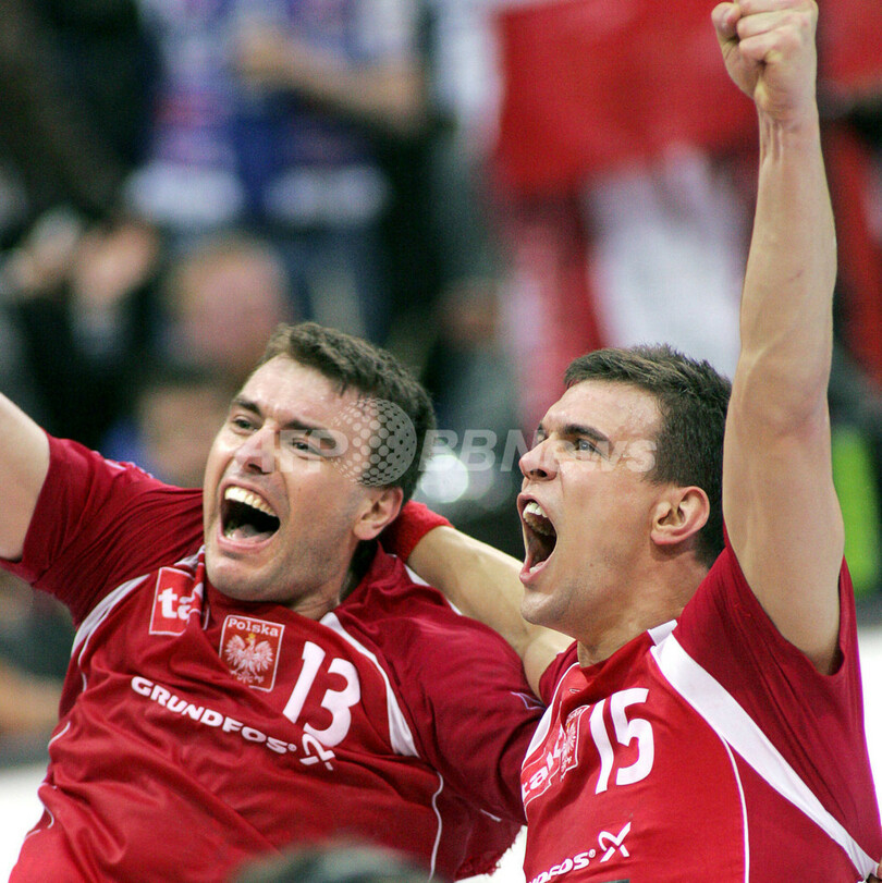 【ハンブルク/ドイツ】ハンドボール、男子ハンドボール世界選手権2007(Men’s Handball World Championship)・準決勝、ポーランドvsデンマーク。試合はポーランドが36-33で勝利し、決勝進出を決めた。尚、敗れたデンマークは3-4決定戦に回る。写真は、勝利を決めて喜びを爆発させるポーランドのBartosz Jurecki(左)とMichal Jurecki。(c)AFP/ATTILA KISBENEDEK