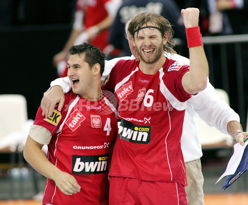 【ハンブルク/ドイツ】ハンドボール、男子ハンドボール世界選手権2007(Men’s Handball World Championship)・準決勝、ポーランドvsデンマーク。試合はポーランドが36-33で勝利し、決勝進出を決めた。尚、敗れたデンマークは3-4決定戦に回る。写真は、勝利を決めて喜びを爆発させるポーランドのBartosz Jurecki(左)とMichal Jurecki。(c)AFP/ATTILA KISBENEDEK