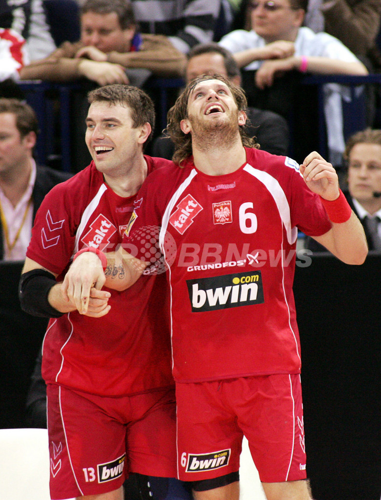 【ハンブルク/ドイツ】ハンドボール、男子ハンドボール世界選手権2007(Men’s Handball World Championship)・準決勝、ポーランドvsデンマーク。試合はポーランドが36-33で勝利し、決勝進出を決めた。尚、敗れたデンマークは3-4決定戦に回る。写真は、勝利を決めて喜びを爆発させるポーランドのBartosz Jurecki(左)とMichal Jurecki。(c)AFP/ATTILA KISBENEDEK
