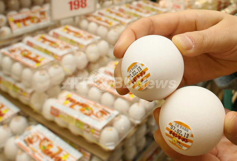 写真は2日、都内のダイエー店舗で販売される「日清チキンラーメン」の広告つきタマゴ。(c)AFP/ KAZUHIRO NOGI