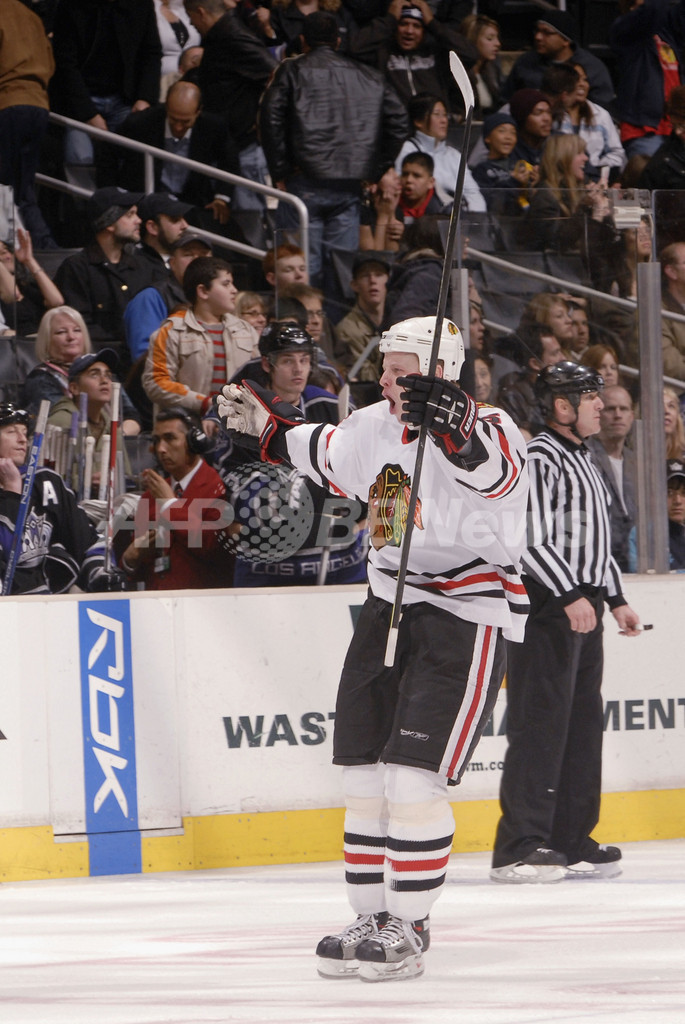 【ロサンゼルス/米国 1日 AFP】06-07NHL、ロサンゼルス・キングス(Los Angeles Kings)vsシカゴ・ブラックホークス(Chicago Blackhawks)。ブラックホークスのラッセ・クッコネン(Lasse Kukkonen)はオーバータイム57秒に決勝ゴールを決め、ブラックホークスが3-2でキングスに勝利し、今季19勝目を挙げた。写真は決勝ゴールを決めて歓喜するクッコネン。(c)AFP/Getty Images Juan Ocampo