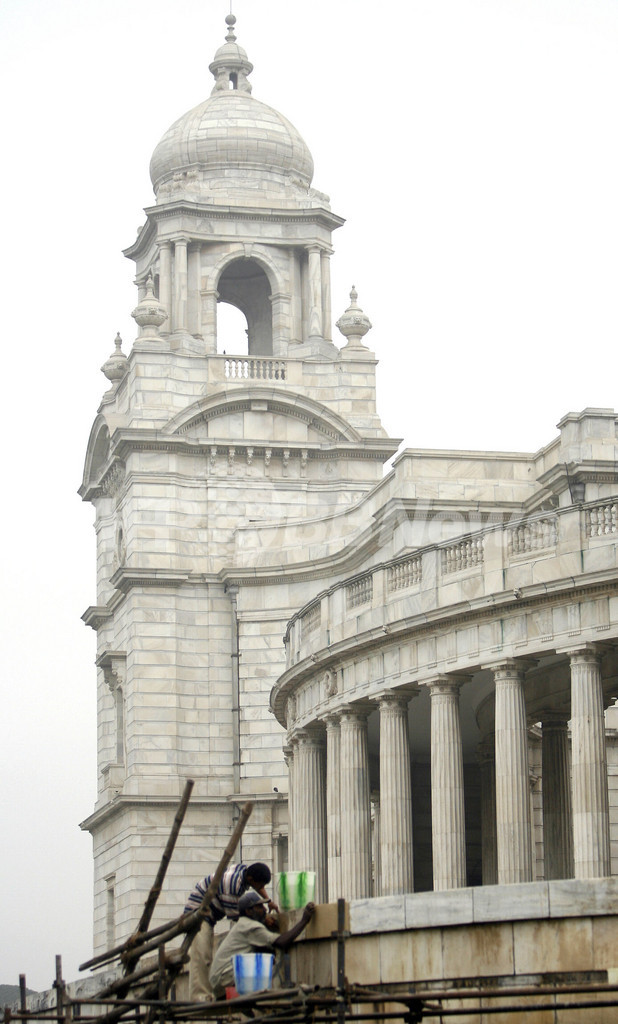 【コルカタ/インド 3日 AFP】同市の観光名所の1つ、ビクトリア記念堂(Victoria Memorial Hall)では現在、改修工事が進められている。1901年に没したインド女帝を兼任したビクトリア女王(Queen Victoria)を記念して1921年に完成したこの記念堂は、ビクトリア朝時代の絵画や美術品などを展示・公開し、博物館として使用されている。写真は改修工事中の記念堂(2007年2月2日撮影)。(c)AFP/Deshakalyan CHOWDHURY
