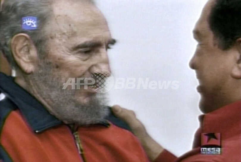 【ハバナ/キューバ 3日 AFP】フィデル・カストロ(Fidel Castro)議長が前月30日にベネズエラのウゴ・チャベス(Hugo Chavez)大統領とテレビ出演を果たし、術後の順調な回復を見せたことで、カストロ議長の死を待望していた反対勢力の期待は裏切られる格好となった。チャベス大統領とキューバ政府当局は、映像が示すとおり現在80歳になるカストロ議長は6か月前の手術から着実に回復していると主張。党機関誌の「Granma daily」は2日、カストロ議長の死亡に向けて祝賀行事の準備を計画していた亡命者らを愚弄(ぐろう)する記事を掲載した。写真は1月30日放送の番組に出演したカストロ議長(左)とチャベス大統領(右)。(c)AFP