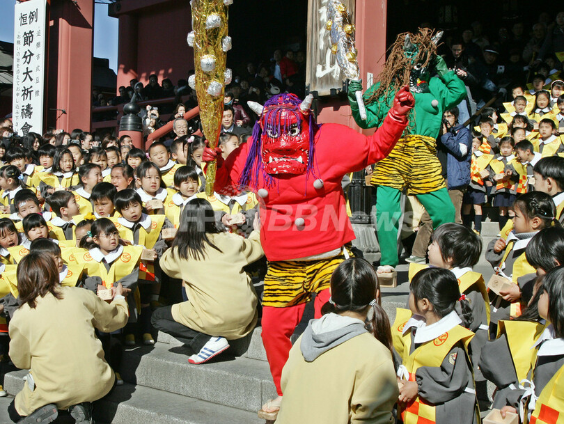ニュース ライフ 浅草寺で園児たちが豆まき - 東京 2007年2月3日 13:31 発信地:東京 [ アジア・オセアニア 東京 ] このニュースをシェア ‹ › ❮ 4/5 ❯ 写真は園児たちが見守る中、登場した鬼。(c)AFP/Yoshikazu TSUNO 画像作成中 ! 【東京 3日 AFP】台東区にある浅草寺で3日、毎年恒例の節分会が行なわれた。集まった約400人の園児たちは、お面をかぶった鬼が登場すると、災厄の退散、福の到来を願って元気よく豆をまいた。写真は一斉に豆をまく園児たち。(c)AFP/Yoshikazu TSUNO ライフ 一覧へ> メディア・報道関係・法人の方向け 写真・動画 購入のお問合せ>