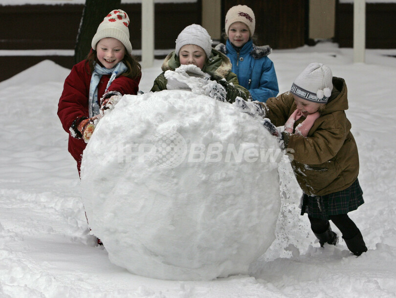 写真はモスクワの学校で、雪遊びをするの子供たち。(2005年3月18日撮影)。(C)AFP/YURY KADOBNOV