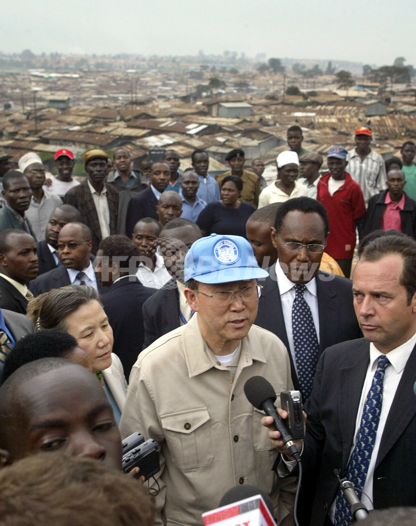 写真は1月30日、ケニアの貧民街で記者団の取材に応える潘事務総長。(c)AFP/TONY KARUMBA