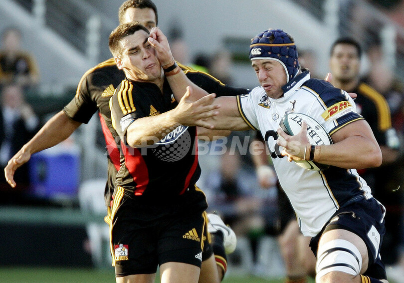 【ハミルトン/ニュージーランド 3日 AFP】ラグビー、2007スーパー14・第1節、チーフス(Chiefs、ニュージーランド)vsブランビーズ(Brumbies、オーストラリア)。試合は、21-15でブランビーズが開幕戦を制した。写真は、チーフスのソセネ・アネシ(Sosene Anesi)のタックルを受けながらも攻め上がるブランビーズのスターリング・マートロック(Stirling Mortlock)。(c)AFP/Nigel MARPLE
