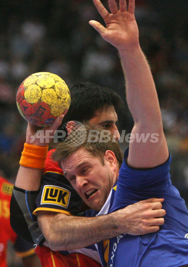 【ケルン/ドイツ 3日 AFP】ハンドボール、男子ハンドボール世界選手権2007(Men’s Handball World Championship)・7-8位決定戦、スペインvsアイスランド。アイスランドのLogi Geirsson(左)のシュートに、両手を広げてゴールを守るスペインGKのJose Hombrados(右)。試合はスペインが40-36でアイスランドに勝利し、7位で大会を終えた。(c)AFP/ATTILA KISBENEDEK