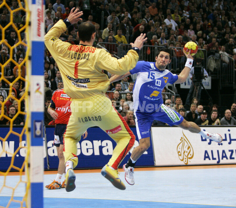 【ケルン/ドイツ 3日 AFP】ハンドボール、男子ハンドボール世界選手権2007(Men’s Handball World Championship)・7-8位決定戦、スペインvsアイスランド。アイスランドのLogi Geirsson(左)のシュートに、両手を広げてゴールを守るスペインGKのJose Hombrados(右)。試合はスペインが40-36でアイスランドに勝利し、7位で大会を終えた。(c)AFP/ATTILA KISBENEDEK
