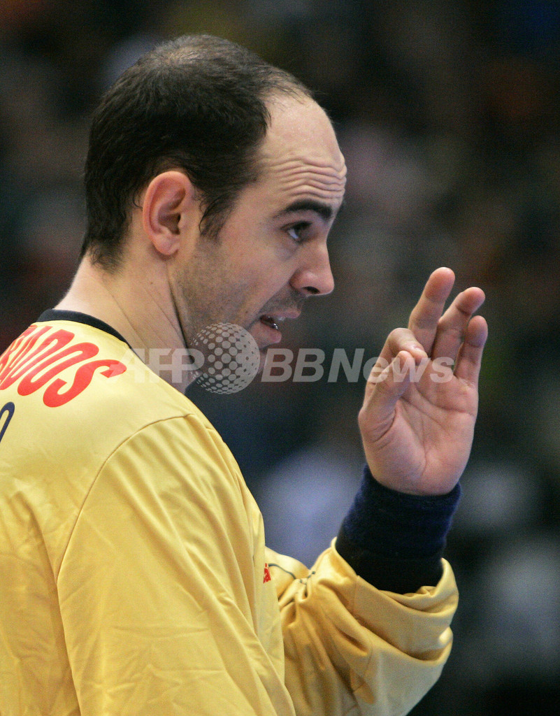 【ケルン/ドイツ 3日 AFP】ハンドボール、男子ハンドボール世界選手権2007(Men’s Handball World Championship)・7-8位決定戦、スペインvsアイスランド。アイスランドのLogi Geirsson(左)のシュートに、両手を広げてゴールを守るスペインGKのJose Hombrados(右)。試合はスペインが40-36でアイスランドに勝利し、7位で大会を終えた。(c)AFP/ATTILA KISBENEDEK