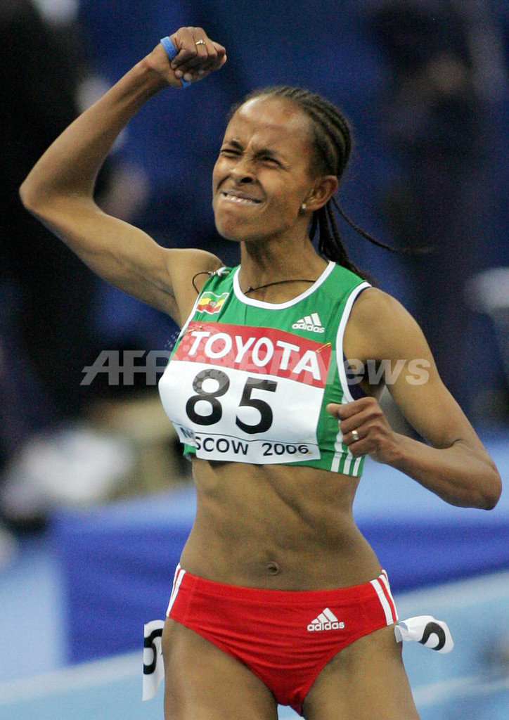 【シュトガルト/ドイツ 3日 AFP】陸上、スパルカッセン杯2007(Sparkassen Cup 2007)女子3000メートル。エチオピアのメセレト・デファール(Meseret Defar)は室内世界新記録となる8分23秒72を記録し優勝を飾った。写真は、第11回世界室内陸上競技選手権大会(11th IAAF World Indoor Championships)で女子3000メートルを制して喜びを爆発させるデファール(2006年3月11日撮影)。(c)AFP/ALEXANDER NEMENOV