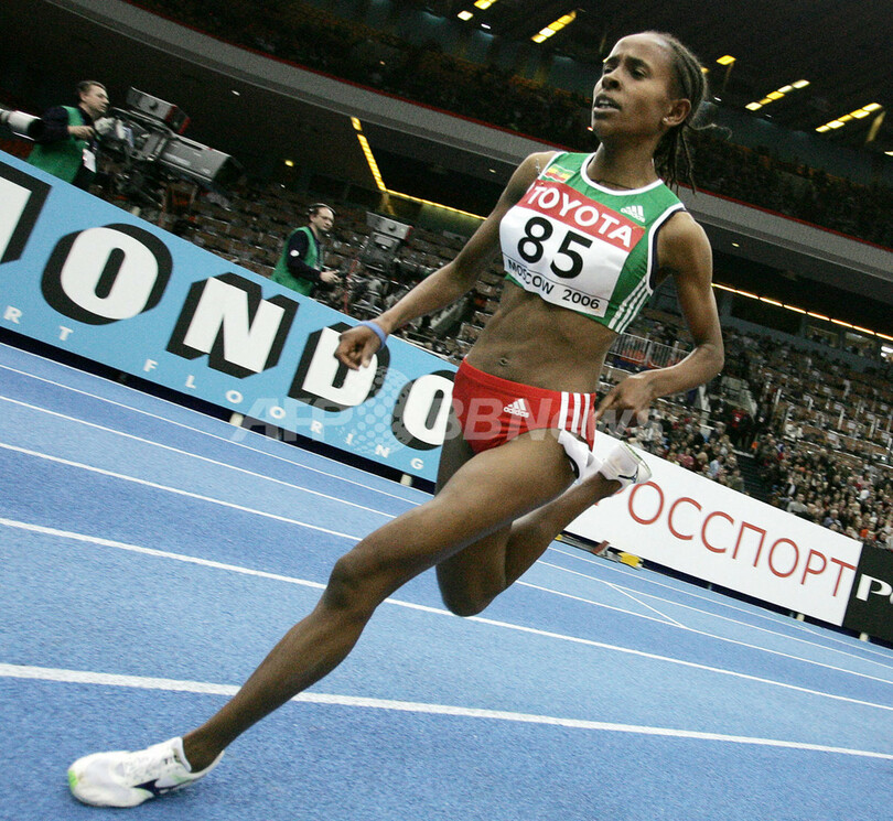【シュトガルト/ドイツ 3日 AFP】陸上、スパルカッセン杯2007(Sparkassen Cup 2007)女子3000メートル。エチオピアのメセレト・デファール(Meseret Defar)は室内世界新記録となる8分23秒72を記録し優勝を飾った。写真は、第11回世界室内陸上競技選手権大会(11th IAAF World Indoor Championships)で女子3000メートルを制して喜びを爆発させるデファール(2006年3月11日撮影)。(c)AFP/ALEXANDER NEMENOV