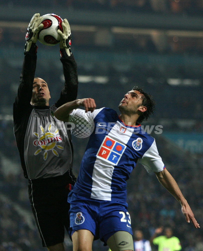 【ポルト/ポルトガル 3日 AFP】サッカー、ポルトガル・スーペルリーガ・第17節、FCポルト(FC Porto)vsエストレラ・ダ・アマドーラ(Estrela Amadora)。試合は後半ロスタイムにアンセルモ(Anselmo)が決勝のゴールを決め、アマドーラが0-1でポルトを降し、リーグ5勝目を挙げ勝ち点を20に伸ばした。写真は、決勝ゴールを決めチームメートに祝福されるアンセルモ(中央)。(c)AFP/NICOLAS ASFOURI