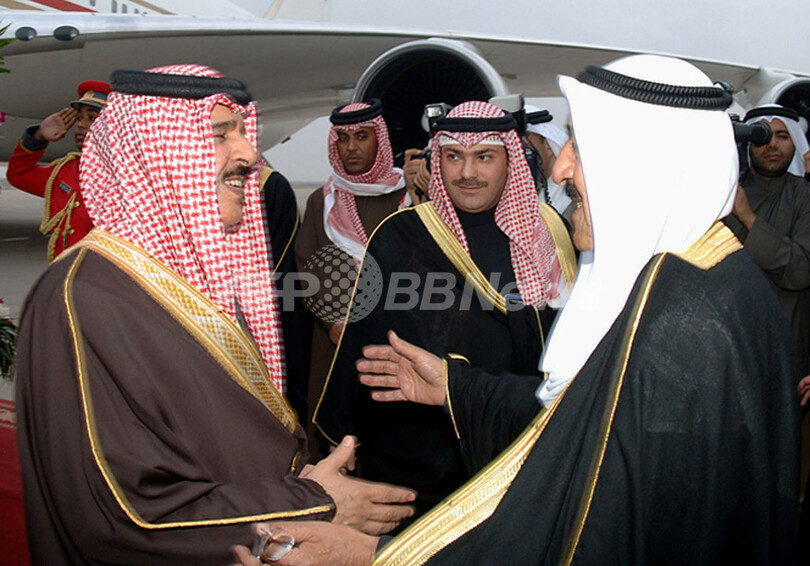 【クウェート市/クウェート 4日 AFP】バーレーンのハマド・ビン・イサ・ファリハ(Hamad bin Issa al-Khalifa)国王は3日、2日間の日程でクウェートを訪問し、イラクと中東情勢について意見を交換する。議題は湾岸地域の情勢が中東地域の治安と安定に及ぼす影響についてなどである。写真は同日、バーレーンのハマド国王(左)を迎える、クウェートのサバハ・アハマド・ジャビル・サバハ(Sabah al-Ahmed al-Jaber al-Sabah)首長(右)。国営クウェート通信(KUNA)提供。(c)AFP/KUNA