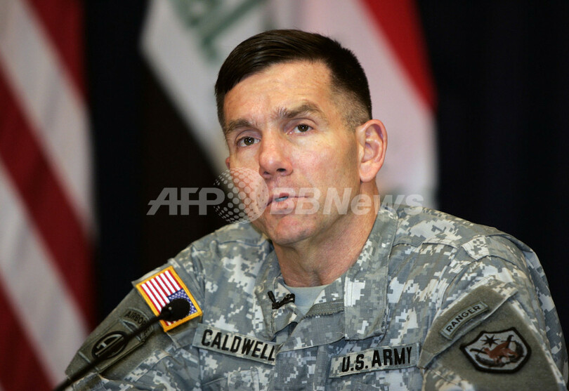 【バグダッド/イラク 4日 AFP】イラク政府のダバグ(Ali al-Dabbagh)報道官は4日、バグダッドでのトラックを使用した大規模な自爆攻撃の発生をうけ、国内で発生している攻撃の半分は、シリア経由で侵入した外国勢力によるものであると言明した。この発言により、イラク・シリア両政府の間で緊張が高まっている。写真は4日、バグダッドで記者会見に臨む駐留多国籍軍のウィリアム・コールドウェル(William Caldwell)報道官。(c)AFP/SABAH ARAR