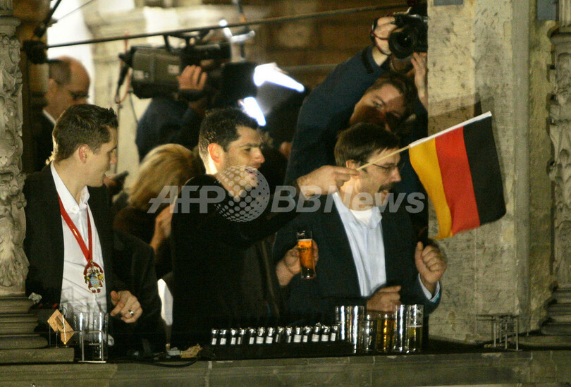 【ケルン/ドイツ 4日 AFP】ハンドボール、男子ハンドボール世界選手権2007(Men’s Handball World Championship)、決勝でポーランドを29-24で降し29年振りの優勝を果たしたドイツチームは、ケルン市庁舎で祝勝会を行い、ファンと共に優勝の喜びを分かち合った。写真は、ファンの声援に応えるGKヘニング・フリッツ(Henning Fritz、中央)とミヒャエル・クラウス(Michael Kraus、左)。(c)AFP/JACQUES DEMARTHON