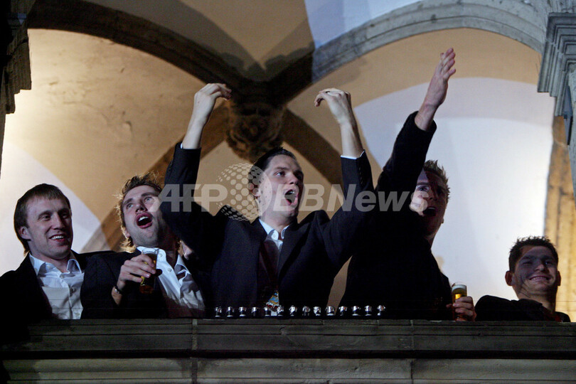 【ケルン/ドイツ 4日 AFP】ハンドボール、男子ハンドボール世界選手権2007(Men’s Handball World Championship)、決勝でポーランドを29-24で降し29年振りの優勝を果たしたドイツチームは、ケルン市庁舎で祝勝会を行い、ファンと共に優勝の喜びを分かち合った。写真は、ファンの声援に応えるGKヘニング・フリッツ(Henning Fritz、中央)とミヒャエル・クラウス(Michael Kraus、左)。(c)AFP/JACQUES DEMARTHON