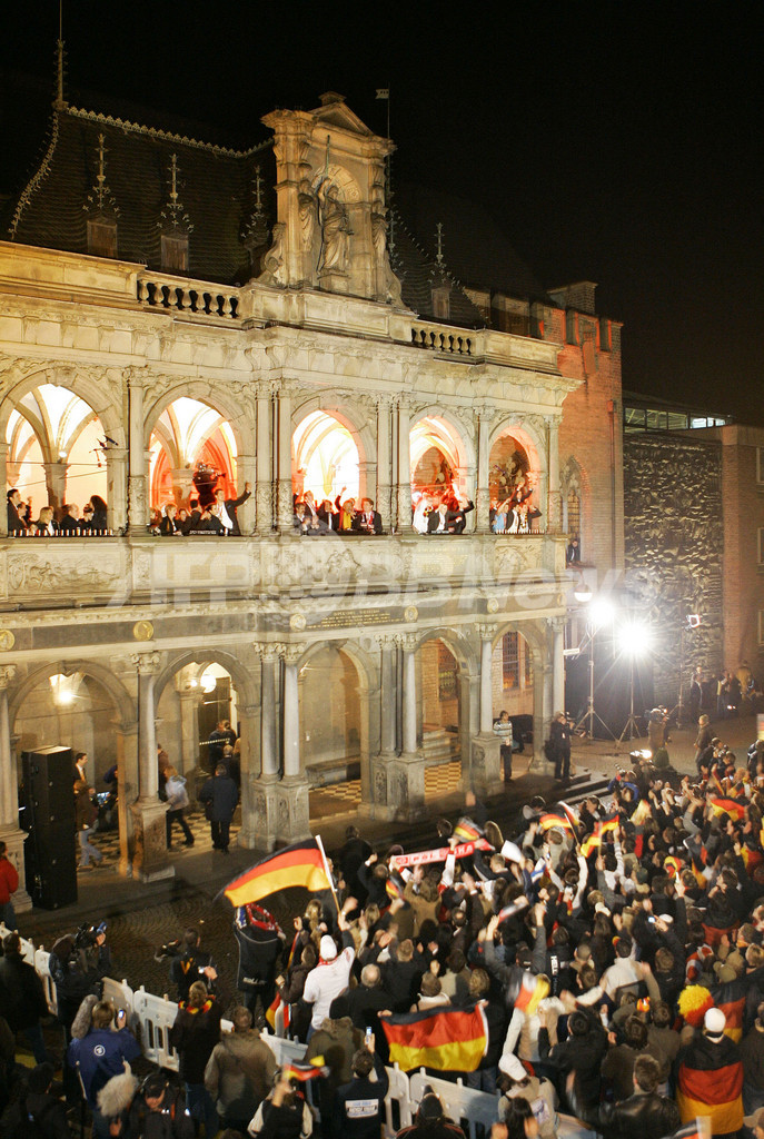 【ケルン/ドイツ 4日 AFP】ハンドボール、男子ハンドボール世界選手権2007(Men’s Handball World Championship)、決勝でポーランドを29-24で降し29年振りの優勝を果たしたドイツチームは、ケルン市庁舎で祝勝会を行い、ファンと共に優勝の喜びを分かち合った。写真は、ファンの声援に応えるGKヘニング・フリッツ(Henning Fritz、中央)とミヒャエル・クラウス(Michael Kraus、左)。(c)AFP/JACQUES DEMARTHON