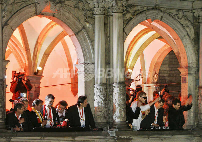 【ケルン/ドイツ 4日 AFP】ハンドボール、男子ハンドボール世界選手権2007(Men’s Handball World Championship)、決勝でポーランドを29-24で降し29年振りの優勝を果たしたドイツチームは、ケルン市庁舎で祝勝会を行い、ファンと共に優勝の喜びを分かち合った。写真は、ファンの声援に応えるGKヘニング・フリッツ(Henning Fritz、中央)とミヒャエル・クラウス(Michael Kraus、左)。(c)AFP/JACQUES DEMARTHON