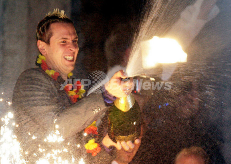 【ケルン/ドイツ 4日 AFP】ハンドボール、男子ハンドボール世界選手権2007(Men’s Handball World Championship)、決勝でポーランドを29-24で降し29年振りの優勝を果たしたドイツチームは、ケルン市庁舎で祝勝会を行い、ファンと共に優勝の喜びを分かち合った。写真は、ファンの声援に応えるGKヘニング・フリッツ(Henning Fritz、中央)とミヒャエル・クラウス(Michael Kraus、左)。(c)AFP/JACQUES DEMARTHON