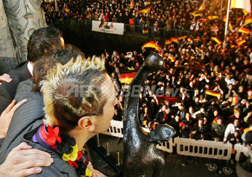 【ケルン/ドイツ 4日 AFP】ハンドボール、男子ハンドボール世界選手権2007(Men’s Handball World Championship)、決勝でポーランドを29-24で降し29年振りの優勝を果たしたドイツチームは、ケルン市庁舎で祝勝会を行い、ファンと共に優勝の喜びを分かち合った。写真は、ファンの声援に応えるGKヘニング・フリッツ(Henning Fritz、中央)とミヒャエル・クラウス(Michael Kraus、左)。(c)AFP/JACQUES DEMARTHON