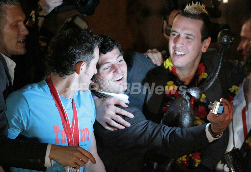 【ケルン/ドイツ 4日 AFP】ハンドボール、男子ハンドボール世界選手権2007(Men’s Handball World Championship)、決勝でポーランドを29-24で降し29年振りの優勝を果たしたドイツチームは、ケルン市庁舎で祝勝会を行い、ファンと共に優勝の喜びを分かち合った。写真は、ファンの声援に応えるGKヘニング・フリッツ(Henning Fritz、中央)とミヒャエル・クラウス(Michael Kraus、左)。(c)AFP/JACQUES DEMARTHON