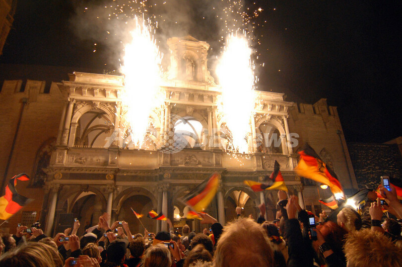 【ケルン/ドイツ 4日 AFP】ハンドボール、男子ハンドボール世界選手権2007(Men’s Handball World Championship)、決勝でポーランドを29-24で降し29年振りの優勝を果たしたドイツチームは、ケルン市庁舎で祝勝会を行い、ファンと共に優勝の喜びを分かち合った。写真は、ファンの声援に応えるGKヘニング・フリッツ(Henning Fritz、中央)とミヒャエル・クラウス(Michael Kraus、左)。(c)AFP/JACQUES DEMARTHON