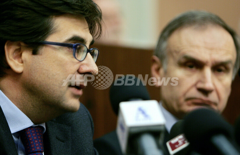 写真は、会議後の会見に臨むペトルー五輪委員会会長(右)パンカリ伊サッカー連盟代表(左)。(c)AFP/Filippo MONTEFORTE